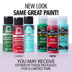 FolkArt Multi-Surface Acrylic Paint provides a wide array of beautiful colors perfect for the crafter and decorative painter. Each of the colors in this line of superior quality acrylic paints has a creamy, smooth consistency with excellent coverage. Whether you are a novice or expert crafter, you will love the versatility of this acrylic paint as part of your arts and crafts supplies. Use this multi-surface paint on a variety of surfaces such as wood, terra cotta, canvas, glass, fabric, ceramics and more. With this multi-surface acrylic paint, you can do everything from intricate detail work to stenciling for a fresh look to all your DIY projects. This formula is also great for indoor and outdoor projects as well as top-shelf dishwasher safe when cured. Make FolkArt Multi-Surface Acrylic Paint a must-have addition to your art supplies.